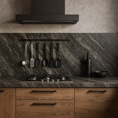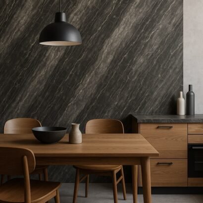 Black Forest Marble is a striking natural stone defined by its dramatic charcoal, silver, and smoky grey veining flowing through a deep stone base. Inspired by nature’s raw elegance, each slab is completely unique, delivering bold character while maintaining a refined, timeless appeal.