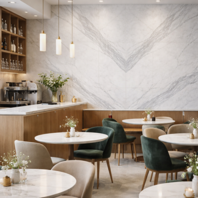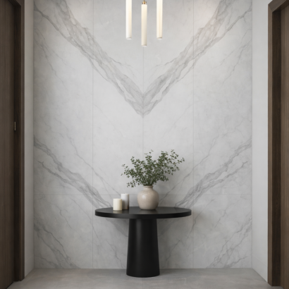 Perfect for statement walls, entry foyers, bathrooms, cafés, restaurants, and reception areas, Bookmatched Bianco White transforms walls into a focal point with minimal grout lines and a clean, contemporary finish.